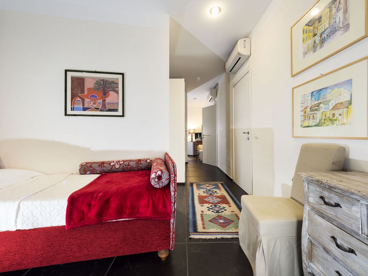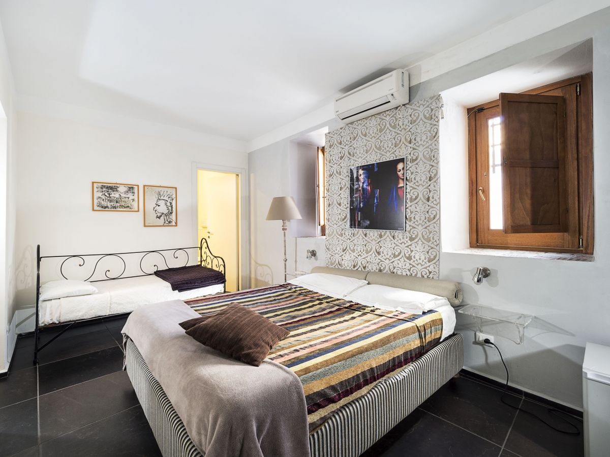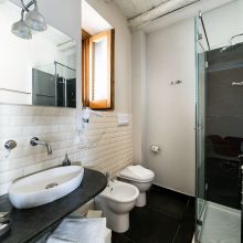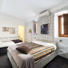 - 2 Suite rooms (33/36 m²) for 2 - 4 guests, with two bathrooms. One features a double bed, two single beds, and two large windows overlooking the courtyard. The other has a double bed, a double sofa bed, and a small balcony overlooking the garden