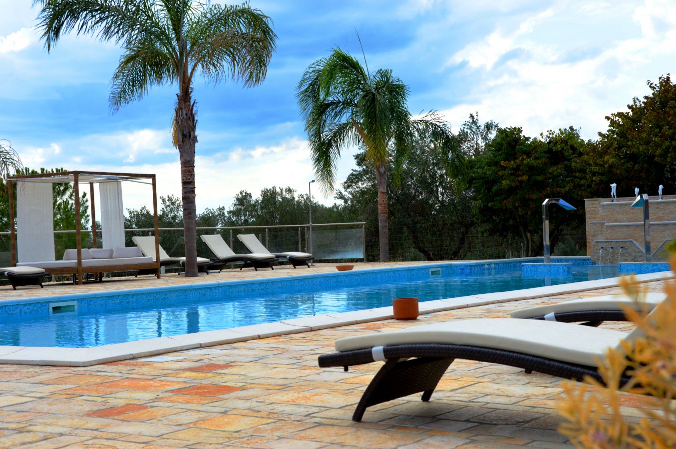 12 m X 5 m, con postazioni idromassaggio, giochi d’acqua, lettini esposti al sole e aree relax in ombra