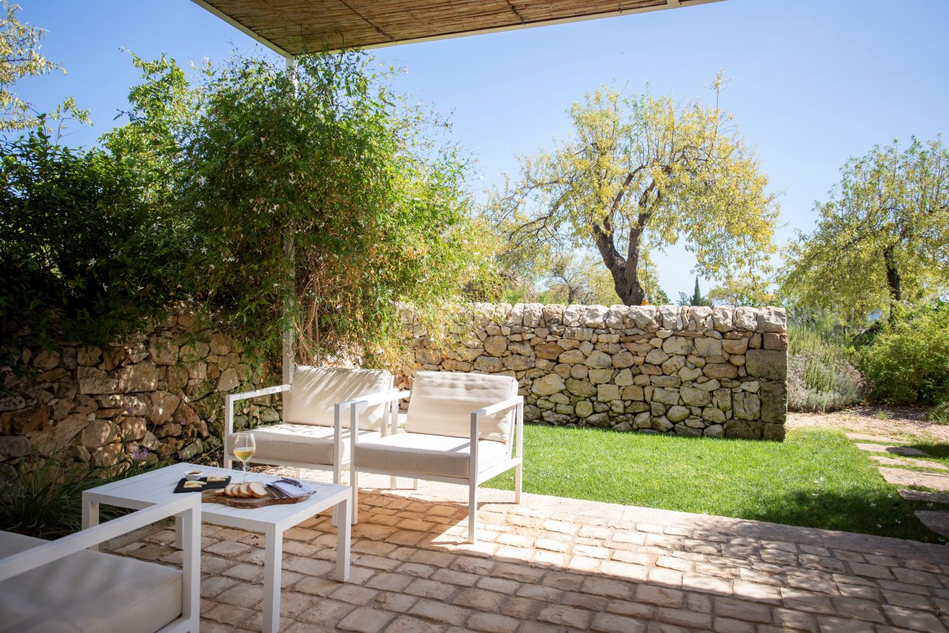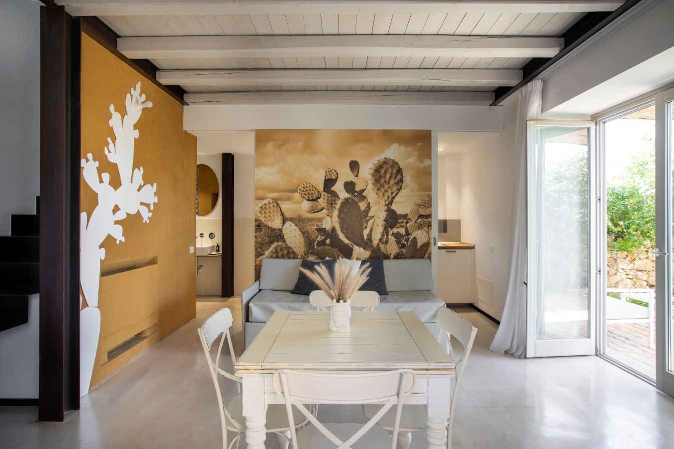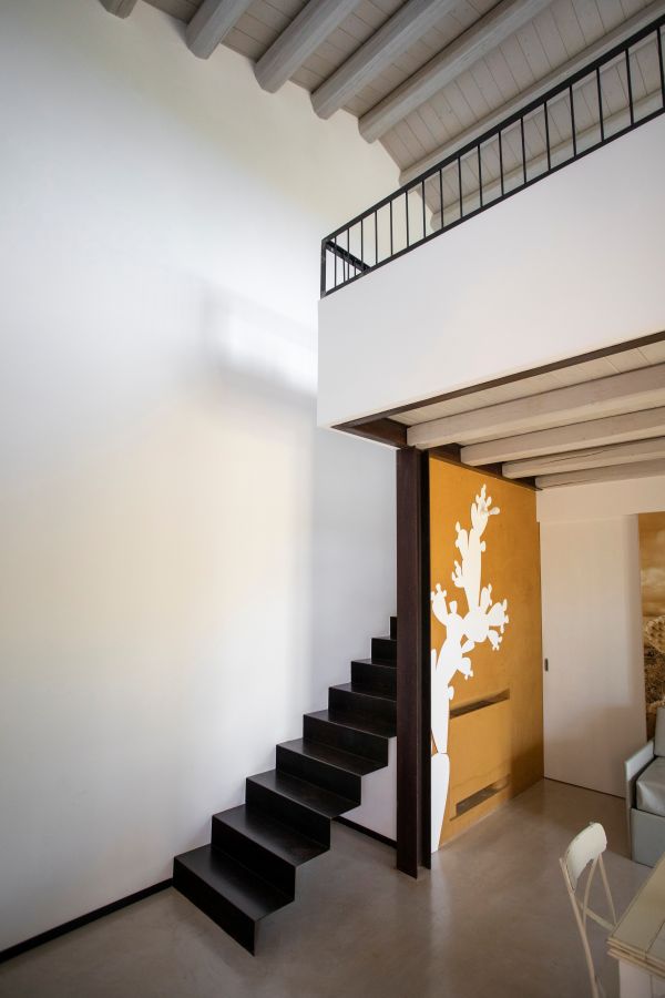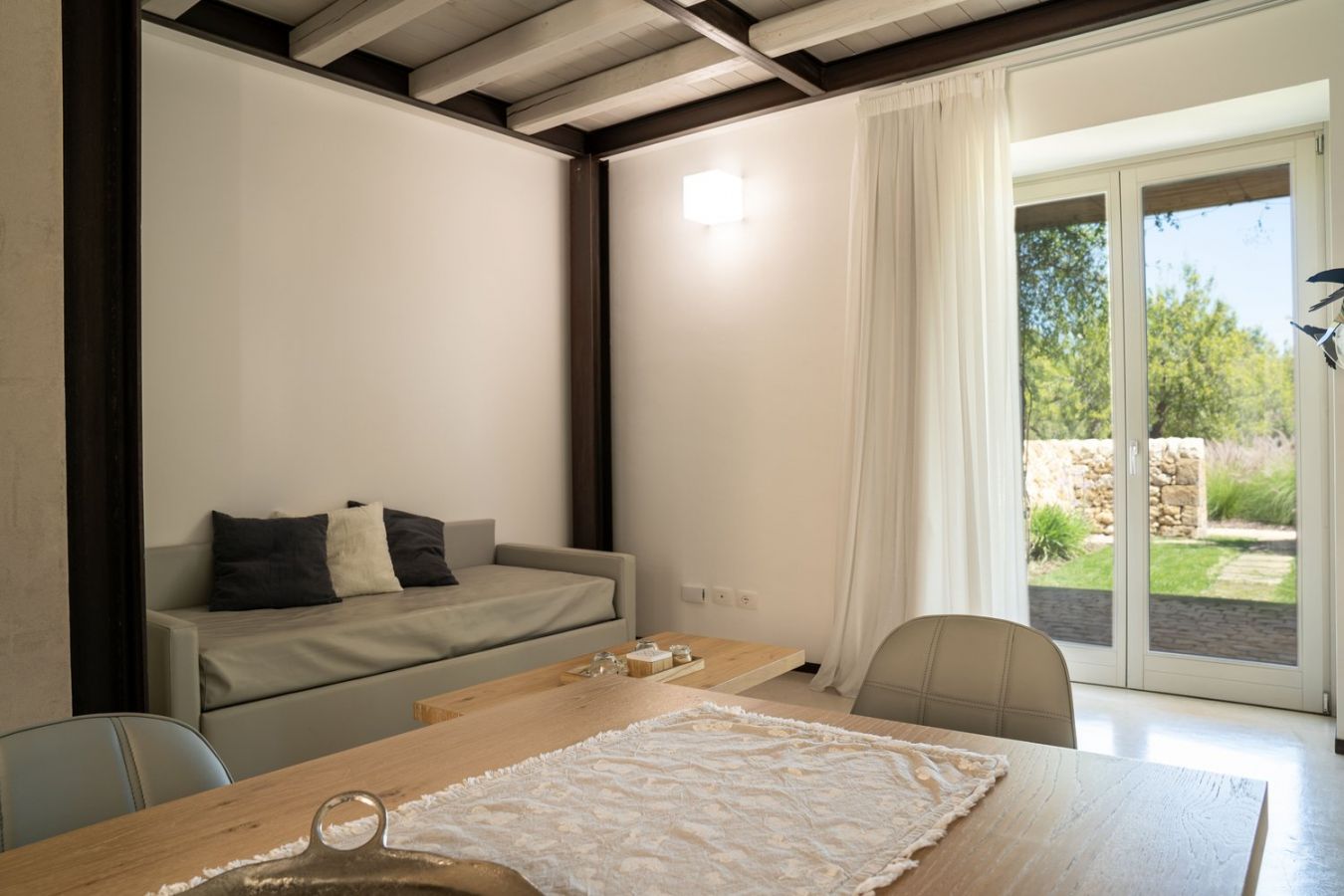 - Suites Fico d’India e Fienile (54 m²). Camere su due livelli per 2+2 ospiti, con ampio soggiorno con divano letto doppio e bagno al piano terra, camera matrimoniale al piano superiore. Ingresso indipendente e veranda e giardino privati arredati