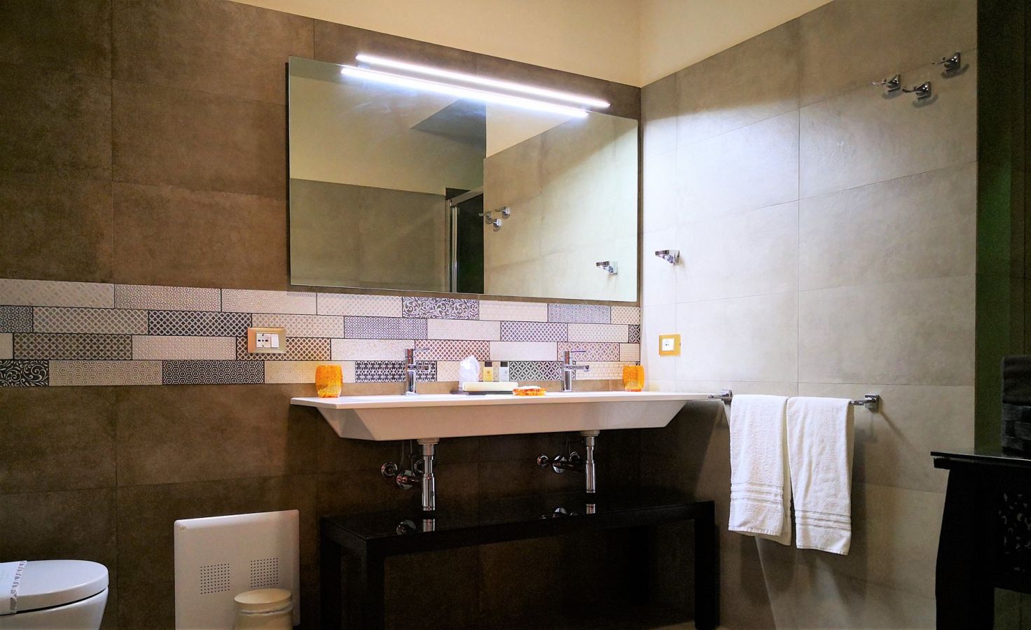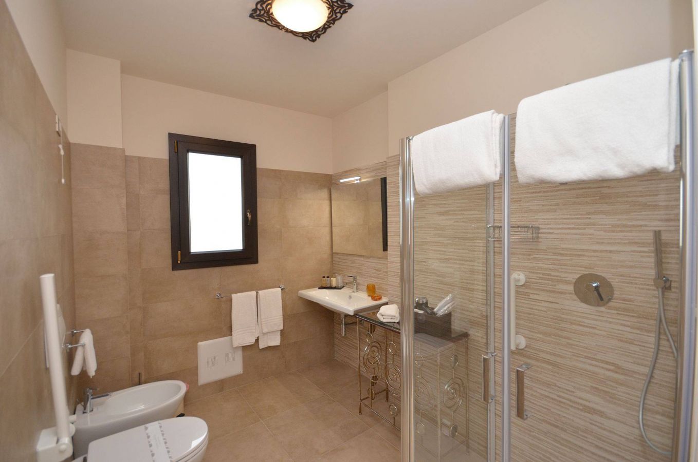 - 1 camera deluxe (30 mq) al primo piano, con letto matrimoniale + 2 letti singoli, per 3 o 4 ospiti. Finestra con affaccio sul patio. Ampio bagno con doppio lavabo e grande doccia emozionale